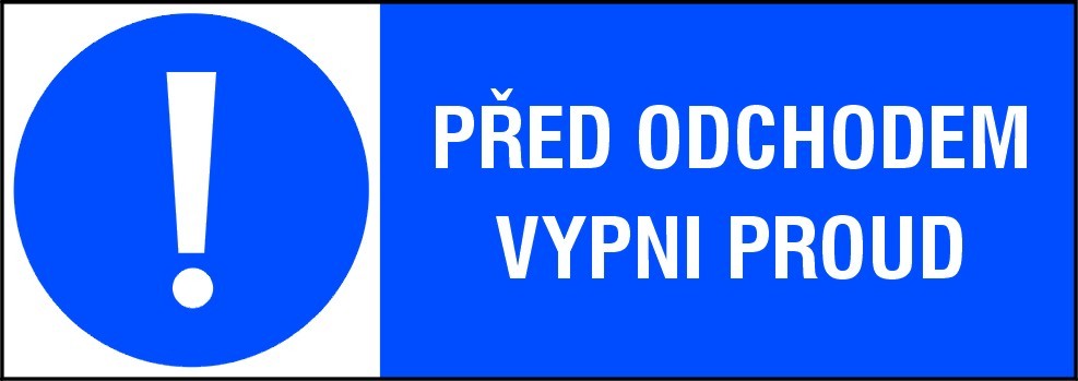 Samolepicí etiketa „PŘED ODCHODEM VYPNI PROUD“.