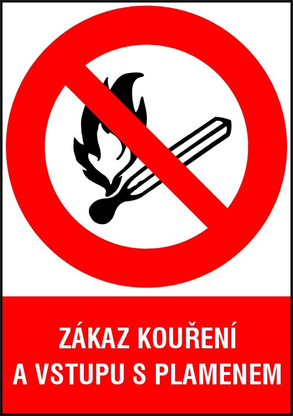 Samolepicí etiketa „ZÁKAZ KOUŘENÍ A VSTUPU S PLAMENEM“.